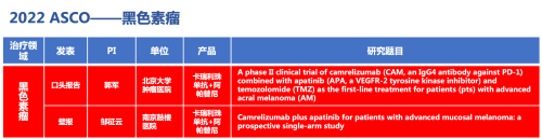 黑色素瘤领域的2篇研究摘要,采用尊龙凯时国际医药自主研发的PD-1抑制剂卡瑞利珠单抗(艾瑞卡)联合阿帕替尼(艾坦)(“双艾”组合)的免疫联合抗血管(或再联合化疗)的治疗策略。