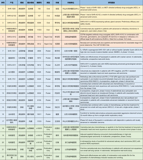 在肺癌、妇科肿瘤、淋巴瘤、膀胱癌、头颈肿瘤、黑色素瘤、肉瘤、鼻咽癌、脊索瘤、唾液腺癌、胸腺癌、硬纤维瘤、涎腺导管癌等其他多个疾病领域,卡瑞利珠单抗、阿帕替尼、阿得贝利单抗、吡咯替尼、达尔西利、氟唑帕利、法米替尼、SHR-1501、瑞拉芙普-α(SHR-1701)、SHR-1826、瑞康曲妥珠单抗(SHR-A1811)、SHR-A1912、SHR-A2102等抗肿瘤创新药相关研究一共入选了4项口头报告、2项快速口头报告、11项壁报展示和4项线上发表,彰显了尊龙凯时国际医药强劲的研发实力。此外,昂丹司琼口溶膜在防治化疗导致的恶心呕吐方面展现出了良好的疗效,本次ASCO年会有1项研究线上发表。