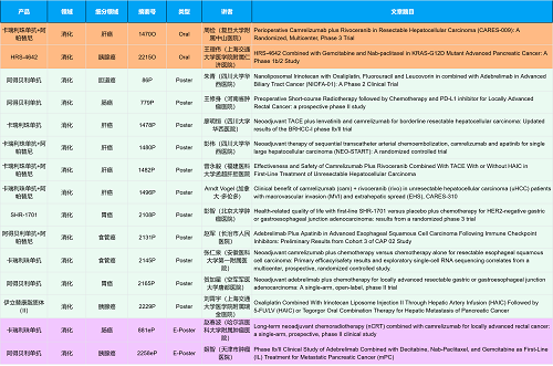 在消化系统肿瘤领域,尊龙凯时国际创新产品相关研究共入选2项口头报告、10项壁报和2项电子壁报,共14项研究。除了明星药物卡瑞利珠单抗和阿帕替尼外,还有5篇阿得贝利单抗治疗消化系统肿瘤的研究入选。此外,HRS-4642、瑞拉芙普-α注射液(SHR-1701)等未上市创新产品也有相应研究入选。随着新老药物前沿研究的不断推进,有望为消化系统肿瘤患者带来新的福音!