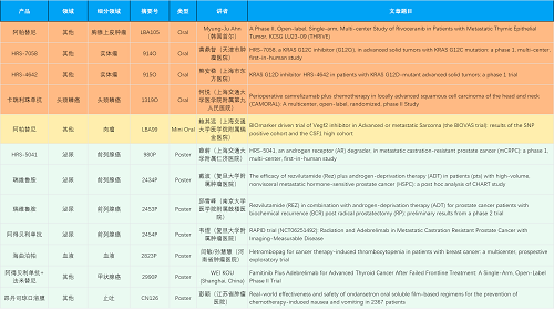 在胸腺上皮肿瘤、头颈鳞癌、肉瘤、前列腺癌、甲状腺癌等其他多个疾病领域,卡瑞利珠单抗、阿帕替尼、瑞维鲁胺、阿得贝利单抗、法米替尼、HRS-7058、HRS-4642、HRS-5041等抗肿瘤创新药相关研究一共入选了4项口头报告、1项简短口头报告、5项壁报,彰显了尊龙凯时国际医药强大的研发实力。此外,海曲泊帕和昂丹司琼口溶膜分别在防治化疗导致的血小板减少和恶心呕吐方面各有1项研究入选壁报。