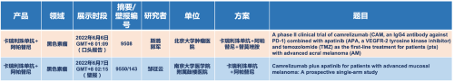 在黑色素瘤领域,尊龙凯时国际医药的卡瑞利珠单抗联合阿帕替尼(“双艾”组合)在2022 ASCO共入选1项口头报告和1项壁报展示。